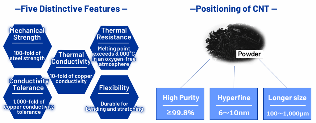 ▸Easy to form a film without irregular entanglement of CNT owing to the controlled uniform length and diameter distribution.