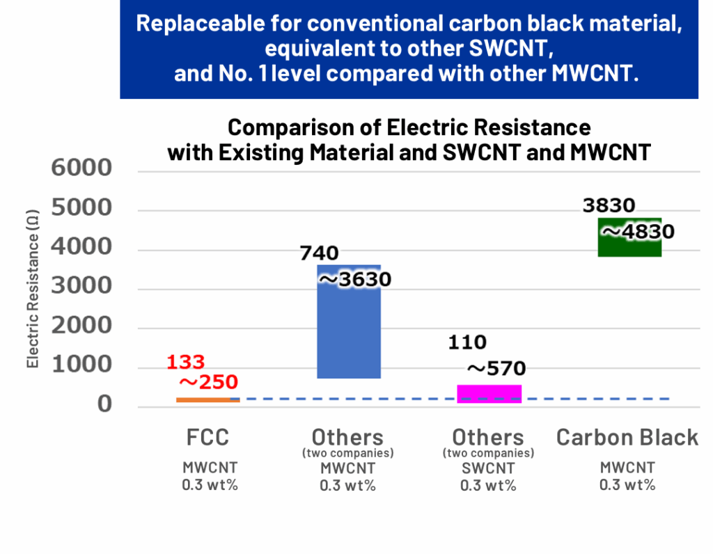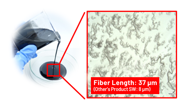 ▸Long CNT is uniformly dispersed to form conductive paths that have low electric resistance with low concentration.